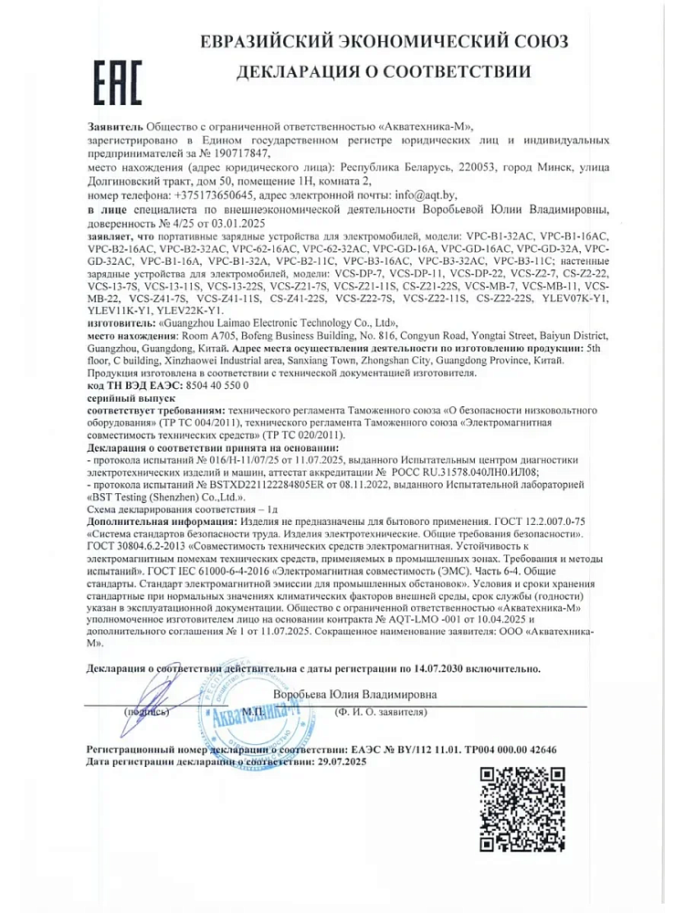 Станция отлично подходит для зарядки современных автомобилей, таких как Zeekr, Lixiang (Li Auto), BYD, Xiaomi, AITO, AVATR, Nio, Xpeng, Voyah, а также версий Volkswagen ID.4 и ID.6 для рынка КНР и других машин, оснащенных портом GBT.